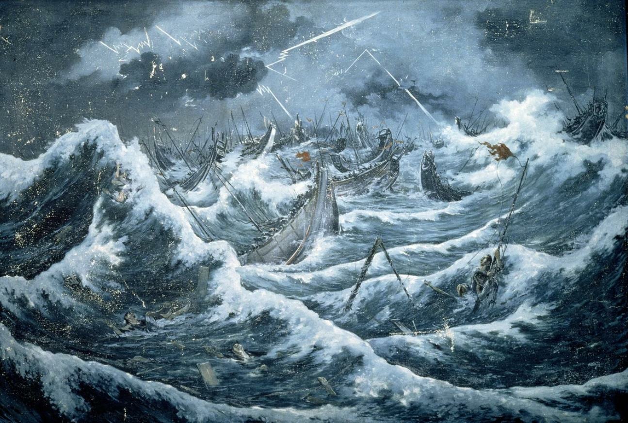 Часть попросту утонула со всем экипажем и войсками, часть была выброшена на скалы и мысы. Уцелело и осталось относительно невредимыми не более 80 судов.