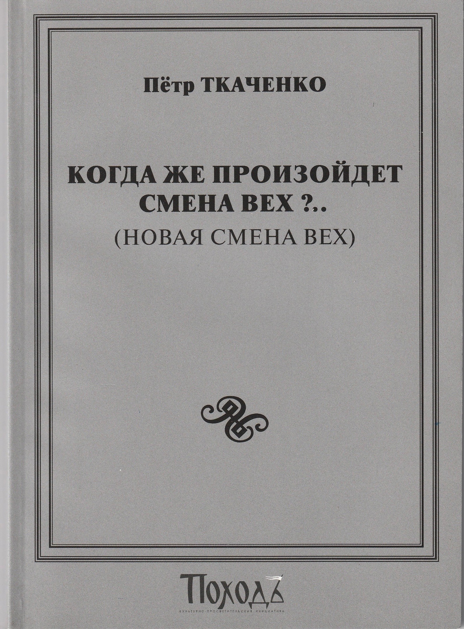 "...Ровно через сто лет после выхода сборника «Вехи» появился новый сборник философских трудов и глубинных размышлений под названием: «Когда же произойдёт смена вех? …(Новая смена вех)». И автором этой работы выступило уже не семь знаменитых философов, учёных, юристов, а лишь один человек - П.И. Ткаченко.