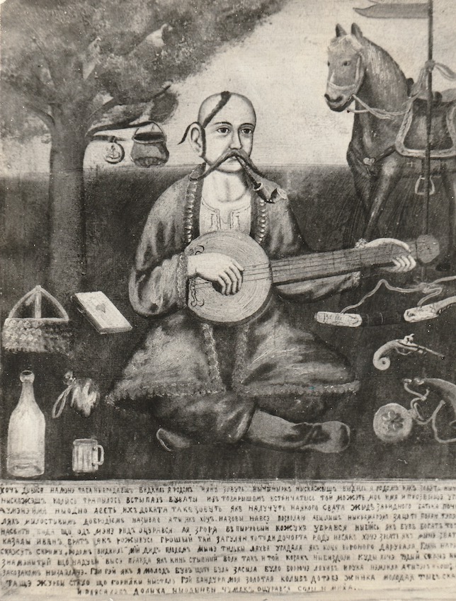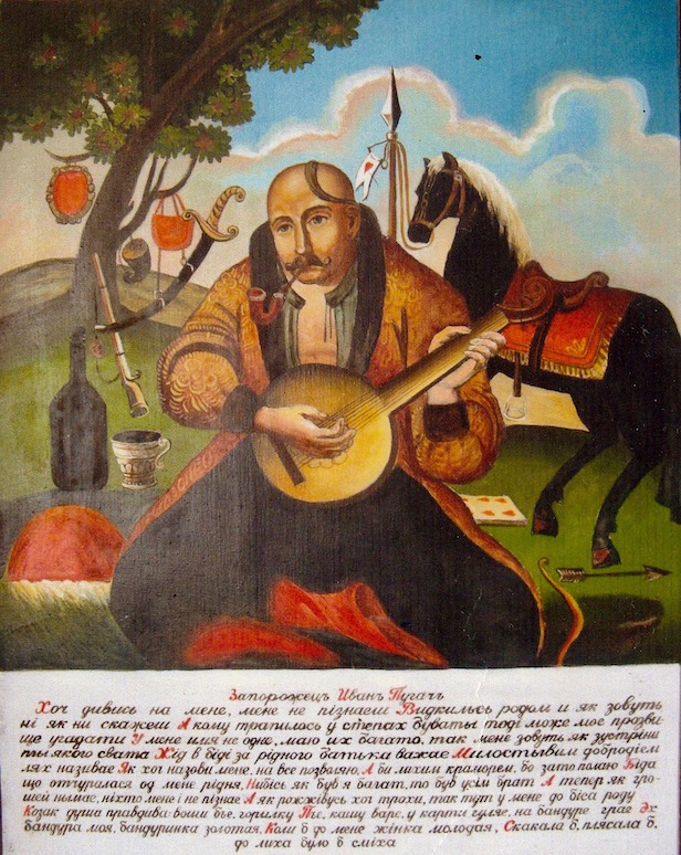 Одну из таких старинных картин мне довелось однажды увидеть в музее станицы Ивановской. На ней, писанной маслом на холсте, был изображён казак с грустным взглядом, седыми усами и чубом-осэлэдцэм, закрученным за ухо. Сидел он под дубом, в руках у него была бандура. Дуб, безусловно, символизировал мироздание, мировое древо, ибо «представление о мировом древе славяне по преимуществу относят к дубу» (А. Афанасьев).