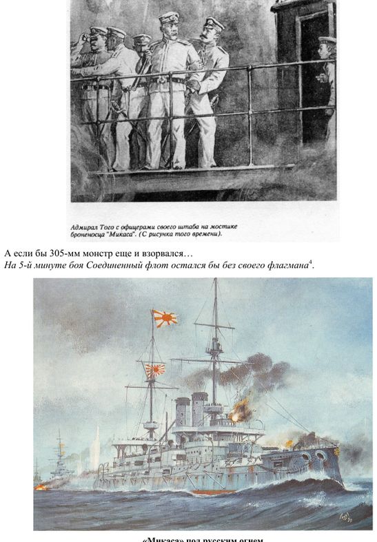 Как не хотят понять до сих пор, что Цусима вообще могла закончиться русской победой уже на 5-й минуте огневого контакта, когда 12-дюймовый снаряд с «Суворова» ударил – естественно, не взорвавшись! − по открытому мостику «Микаса», где стоял Того со своим штабом.