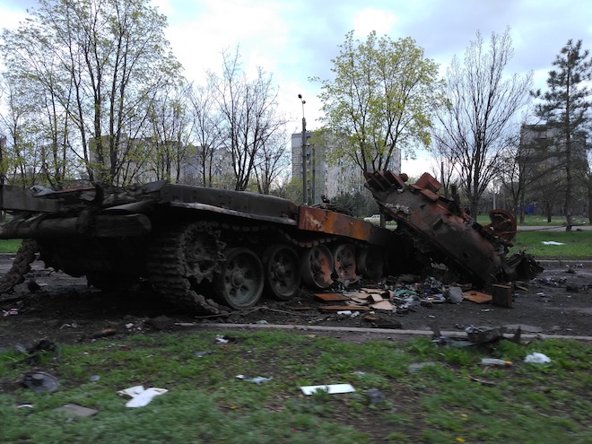 Объезжаю развороченный танк. Наверное, наш – у хохлов таких не было, скорее всего. А вот противотанковое оружие – было. Башня оторвана и валяется чуть в стороне. Видимо, сдетонировал боекомплект. Что испытали ребята, принявшие смерть здесь, на этой улице? Они сгорели или их разорвало? Может, их души до сих пор здесь – смотрят на нас… экскурсантов?!