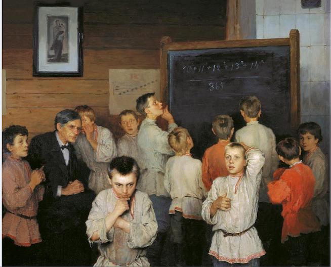 На полотне художника изображен урок арифметики. В углу класса – доска с написанной задачей. Слева от нее сидит учитель, сам Рачинский, а вокруг него – крестьянские ребятишки. Все озабочены: решают задачу. Деловая атмосфера, вернее атмосфера поиска – налицо. И при этом ощущение абсолютной внутренней свободы.