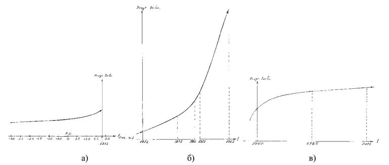 В развернутом Введении к книге «Царская школа» названном «Прогресс как соблазн»[13] была рассмотрена динамика технического прогресса в эпоху «от пирамид до 1812 года» и «от 1812 года до года 1962». Там же приведены графики, условно отображающие эту динамику, и показано, что кривая роста техники за 150 лет от войны 1812 года до первых полетов в космос носит экспоненциальный характер. Один из самых крутых участков кривой этого роста приходится как раз на конец XIX − начало XX веков, − на время царствования Государя Императора Николая II, а самая крутая его часть соответствует 1912-1962 годам.