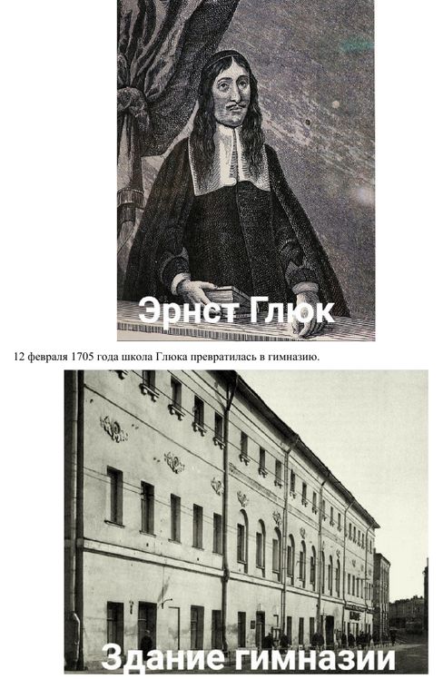 С 1703 года будущую гимназию возглавил пастор Иоганн Эрнст Глюк, попавший за год до этого в плен при взятии Мариенбурга фельдмаршалом Борисом Петровичем Шереметевым. Вместе с ним попала в плен и жившая в его семье служанкой Марта Скавронская, будущая императрица Екатерина I.