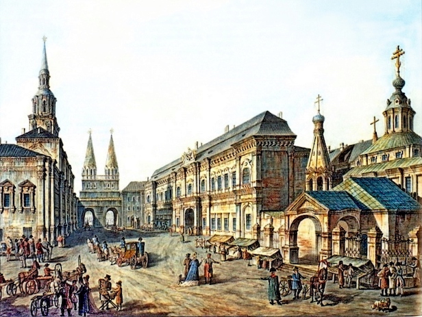 Вид первого здания Московского университета со стороны Красной площади (раскрашенная гравюра конца XVIII в., мастерская Ф.Я. Алексеева). Напротив университета – Монетный двор и мемориальный храм Казанской иконы Божией матери. В день инаугурации университета 26 апреля 1755 г. в нём было совершено торжественное богослужение.