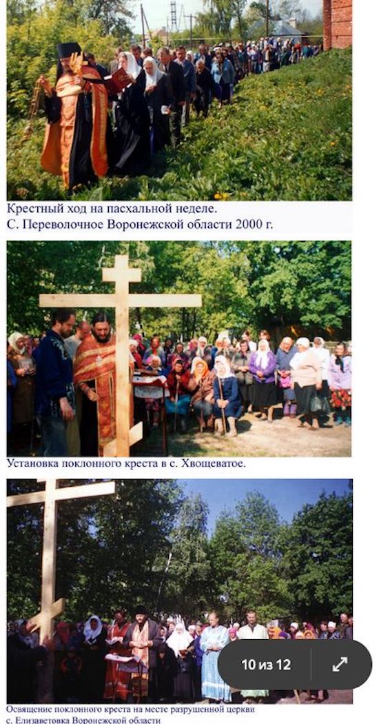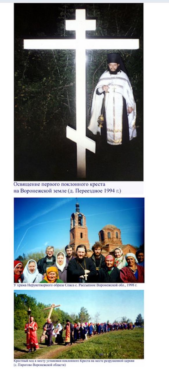 В 2010 году Аграрная партия России наградила меня золотой медалью за работу на селе, в частности, за установку здесь нескольких десятков поклонных крестов. Первый крест мы установили в Переездном при входе на кладбище. Это был один из семи крестов, предназначавшихся для установки на куполах нашего храма. Реставраторы честно признались, что в деревянной основе этих крестов есть трещины, и поэтому они могут обломиться на высоте. Сделали новые кресты, а прежние мы установили в разных селах Воронежской области. Поклонные кресты в этих деревнях стали центром духовной жизни. Всего мы установили в Воронежской области 12 крестов. Организовали вокруг них небольшие общины, снабдили людей богослужебными книгами. Таким образом, собираясь у крестов в воскресные и праздничные дни, жители этих деревень не будут оторваны от общей соборной молитвы нашего народа.