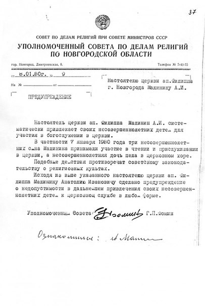 В те времена церковью управляли даже не епископы, а совет по делам религий при совете министров СССР и их представители, областные уполномоченные. Без регистрации у уполномоченного по делам религий не мог служить ни один священнослужитель. И не было страшнее наказания, чем лишение этой регистрации. А поводом к лишению могла послужить любая мелочь. В Калининском художественном училище мне посчастливилось познакомиться с сыном священника Костей Малининым. Сейчас это игумен Корнилий, служит в Твери. Его папа, ныне покойный, протоиерей Анатолий Малинин был настоятелем храма апостола Филиппа в Великом Новгороде. Тогда это был единственный действующий храм в городе. Храм старинный и очень небольшой. Но тогда у него был статус кафедрального собора. Так как из-за малого количества действующих храмов в области две области - Ленинградская и Новгородская - были объединены в одну епархию. И титул правящего архиерея был Ленинградский и Новгородский. В то время им был митрополит Алексий (Ридигер), будущий патриарх. Отец Анатолий был настоящий русский многодетный батюшка, родом из-под Порхова Псковской области. Я с ним познакомился благодаря Косте на зимних каникулах. Вот так мне удалось увидеть жизнь христиан изнутри. Тогда я и узнал про уполномоченных. Что, оказывается, настоятель должен был каждый квартал отправлять уполномоченному отчёт. А также свои проповеди в письменном виде, которые говорил за это время. Но больше всего меня поразило, что даже собственных детей священник не мог привлечь для участия в праздничном богослужении для помощи в алтаре или пении на клиросе. На Рождество 1980 года на свой страх и риск отец Анатолий всё-таки привёл в алтарь двух своих сыновей, а дочь-школьницу поставил петь на клирос. Результат не заставил себя долго ждать: Уже 8 января, на второй день Рождества, батюшку вызвали в областной совет по делам религий, где уполномоченный Фомин устроил священнику настоящий «разнос», главный мотив обвинения преподносился как «пропаганда религии среди несовершеннолетних». Настоятелю пригрозили лишением регистрации. Вот такое «поздравление» устроила советская власть заслуженному протоиерею.