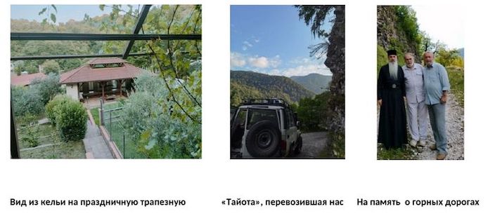 Перед отъездом мы с Олегом Ивановичем решили сохранить в фотографиях память о душеполезном паломничестве к кавказским подвижницам и подвижникам. Опыт показывает, что душевная и духовная полезность паломничества раскрывается постепенно. Для меня было очень важно посмотреть с высоты (физически и духовно) горнего мира на свою деятельность и что-то упрочить в своей жизни. Фаворский горный свет Кавказа, знаки и символы Византийской традиции, увиденные мною, укрепили меня в вере в чудодейственное возрождение Исторической Самодержавной России.