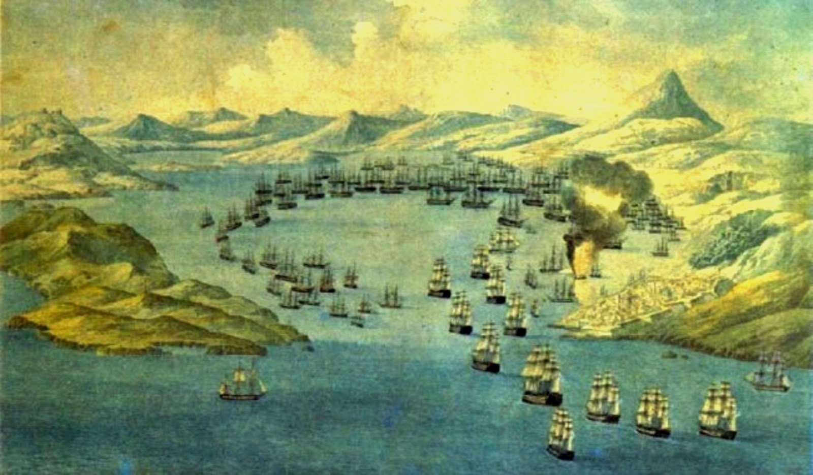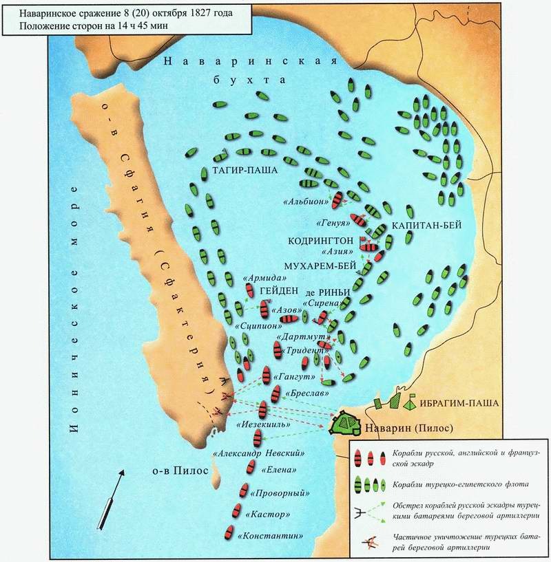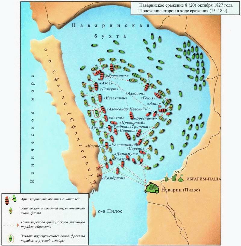 8/20 октября 1827 года между часом и двумя пополудни англо-французская колонна после некоторой сумятицы нерасторопных подчиненных де Риньи втянулась в бухту и отдала якоря в основном на местах, указанных диспозицией вице-адмирала Кодрингтона.