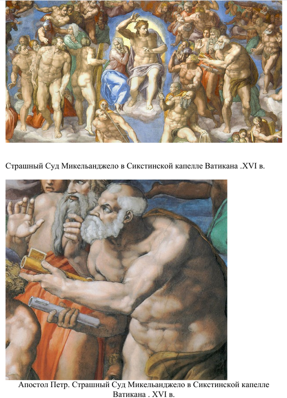 Фреска «Страшный суд», выполненная Микеланджело с 1537 по 1541 годы, покрывает стены алтаря Сикстинской капеллы в Ватикане. Изображение демонстрирует второе пришествия Христа и Апокалипсис, когда человеческие души отправляются в ад или в рай. Фреска изобилует сценами, в которых мужские фигуры сплетаются в объятиях и целуются. Лаццарини считает, что это «несомненно, говорит об их гомосексуальной природе». Искусствовед также полагает, что прорисованные на фреске «напряженные мускулы мужчин» и «анатомические гримасы боли на их лицах» взяты из реальной жизни во время посещения Буонарроти бань, в которых были все условия для сексуальных контактов. Когда фреска была написана, католическую церковь возмутило чересчур натуралистическое описание Микеланджело обнаженных мужских тел, и художника обвинили в непристойности и непотребстве. Бьяджо да Чезена, папский церемониймейстер того времени, заявил, что фреска больше подходит для «общественной бани и таверны», чем для места поклонения. После смерти Буонарроти, художнику Даниэле де Вольтерра (Daniele da Volterra) было поручено закрасить гениталии изображенных на фреске людей, за что он получил прозвище «штанописец»[35].