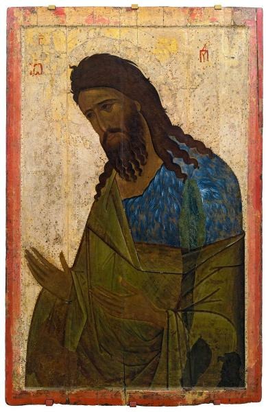 Икона св. Иоанна Предтечи – из семи икон из деисусного ряда иконостаса соборной церкви в честь Зачатия Пресвятой Богородицы Высокого серпуховского монастыря. Написан по заказу Афанасия Высоцкого Старшего в Константинополе в 1380–1390 гг. для белокаменного храма, строившегося в монастыре с 1381 г. по инициативе князя Владимира Андреевича Храброго, прислан ещё при жизни Афанасия Высоцкого Младшего (ум. 12 сентября 1395 г.) вместе с другими иконами и благословенной грамотой. Ныне шесть икон Высоцкого чина находятся в Третьяковской галерее, икона «Святой Иоанн Предтеча» – в Русском музее (с 1934 г.).