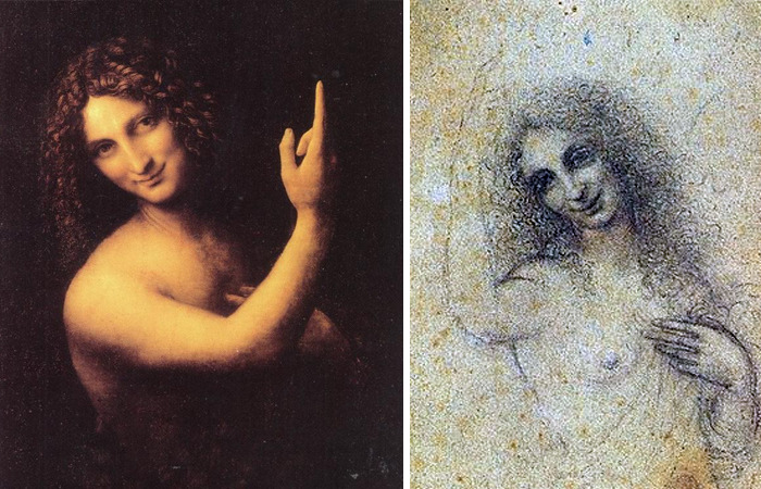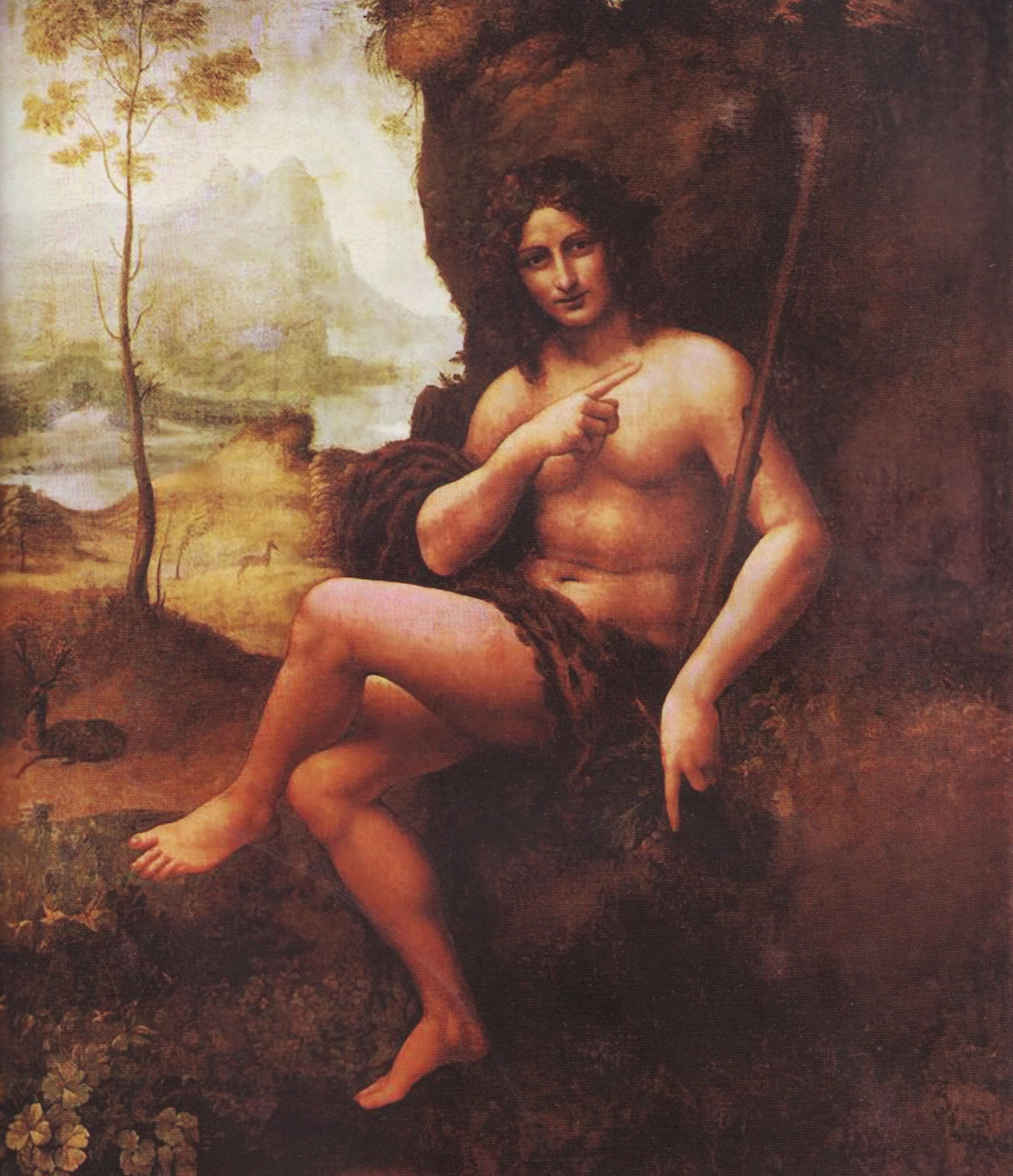 Об этом говорит идентичная поза героя и положение его рук. Вот только на наброске да Винчи изображен Иоанн Креститель. Как же христианский пророк превратился в греческого бога? Согласно одной из версий, которая приписывает авторство «Вакха» да Винчи, изначально картина называлась «Святой Иоанн Креститель в пустыне». Мало того, что пророк был изображен в образе, далеком от канонического, он еще был и полностью обнаженным. Ученый и меценат Кассиано даль Поццо, увидевший работу в Фонтенбло в 1625 году, отметил, что, несмотря на непревзойденное живописное мастерство автора, изображенный на картине мужчина никак не может быть Иоанном Крестителем, поскольку такой неподобающий образ не вызывает религиозного трепета и благочестивых мыслей.