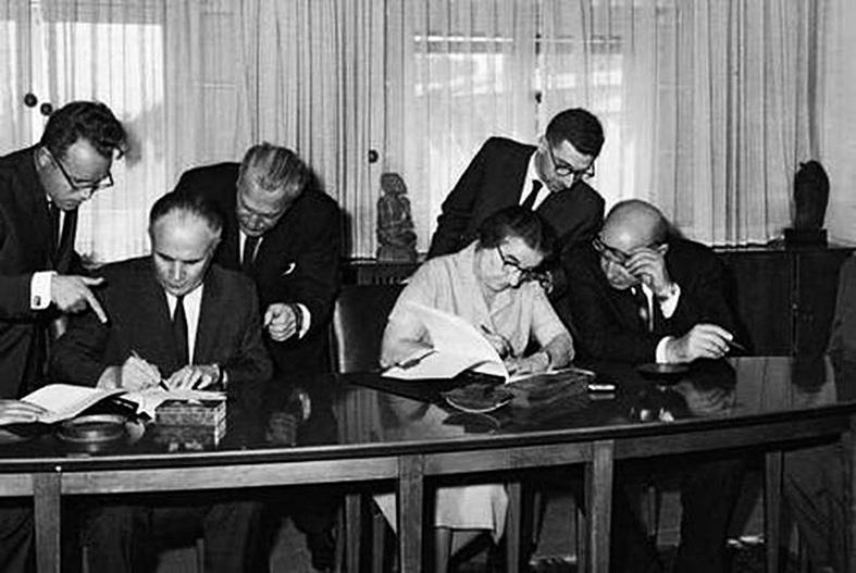 Министр иностранных дел Израиля Голда Меир и чрезвычайный и полномочный посол СССР М. Бодров подписывают Соглашение № 593 «О продаже правительством Союза Советских Социалистических Республик имущества, принадлежащего СССР, правительству государства Израиль».