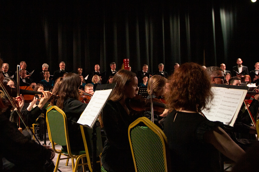 Второй раздел представляла симфония № 2 Евгения Петрова, состоящая из из трех частей: “1. Полет над куполами”, “2. Фрески. Allegro moderato” и “3. Фрески. Sostenuto“. К симфоническому оркестру здесь присоединился камерный хор.