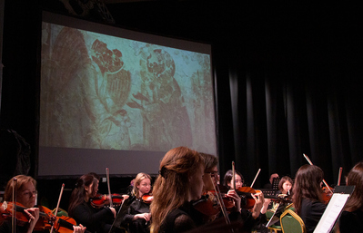 Пришедшие зрители - а их собрался полный зал - не только услышали музыку в лучших традициях русской классики, написанную при этом смелым современным языком, но и увидели архитектурные шедевры Мирожского и Снетогорского монастырей г. Пскова, Успенского храма деревни Мелётово Псковской области, фрески этих древних святынь, а также живописные псковские ландшафты, под впечатлением которых и была создана музыка «высокого стиля симфонии Псковских фресок».