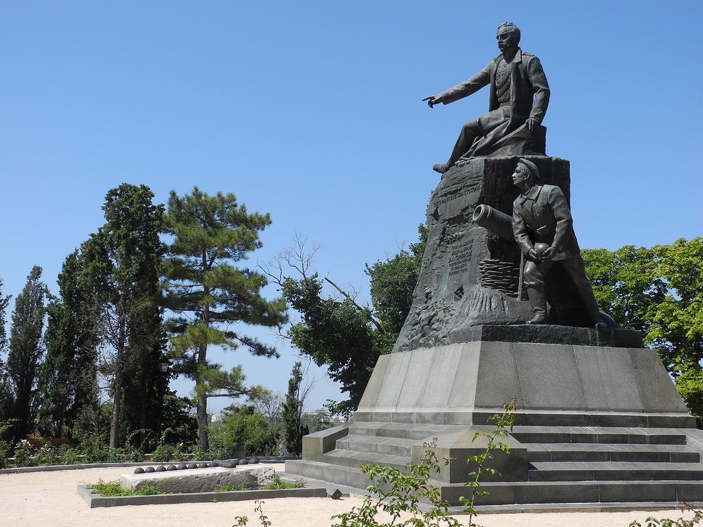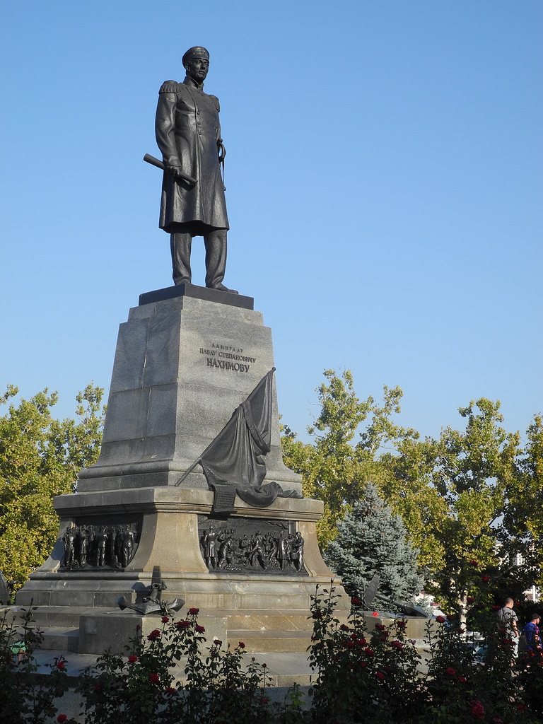 Покинув оборонительную башню, я отыскал то место, где погиб адмирал Павел Степанович Нахимов. Лаконичная надпись на светлой мраморной плите, окруженной невысоким кустарником. Что касается памятника герою Севастопольской «страды», то он установлен в самом центре города, около Графской пристани.