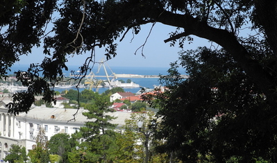 Прибыв в Севастополь, я прежде всего отправился на Малахов курган. На него ведут несколько довольно крутых лестниц - ведь это самая высокая точка города. Странное дело: одолевать широкие, вытертые до блеска ступени нетрудно, один марш, другой, третий, и вот я на вершине кургана; отсюда открывается великолепный вид на город и на Севастопольскую бухту. Хочешь, не хочешь, а надо сделать остановку и присоединиться к многочисленным туристам, которые созерцают редкую панораму. Однако долго задерживаться не стоит, это только начало Малахового кургана.