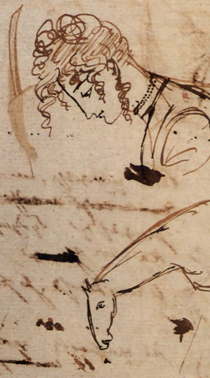 Многие листы Рабочих тетрадей привлекают внимание. Сегодня впервые отмечу изображение на 39 листе (т. 4, ПД 834) и начатые здесь строфы XXXVII, XXXVIII, первые три стиха строфы XXXIX Главы второй «Евгения Онегина» (рис. 5). Первый том Рабочих тетрадей упоминает только «Рисунки: женские портреты» [8:107].