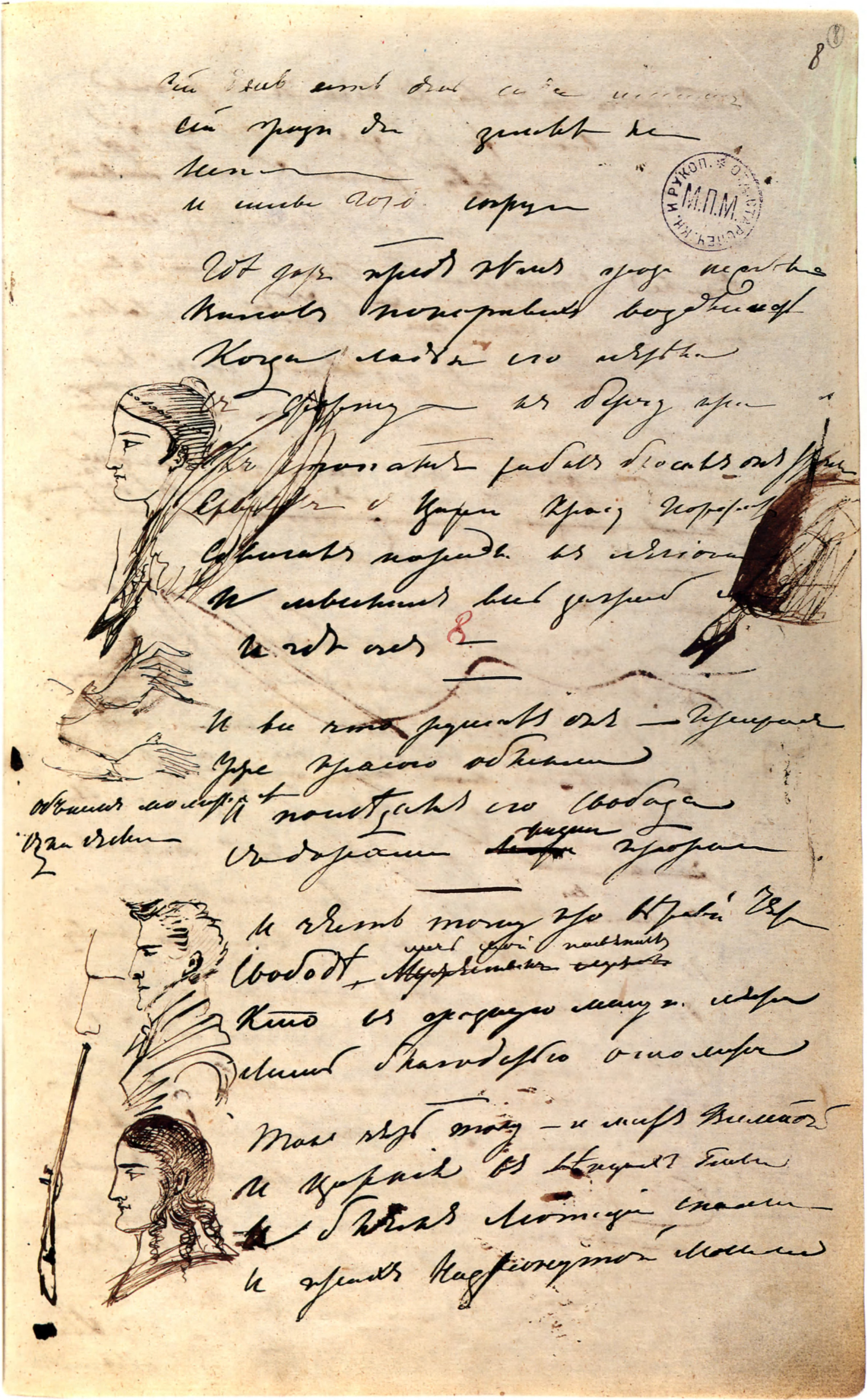 …Замечу, что аналогичное изображение (вверху, слева), думаю, К. Собаньской возникнет и на листе (т. 4, ПД 835, л. 8; рис. 6), где – запись по памяти Пушкиным «стихотворения В.А. Жуковского "Стихи, петые на празднестве посла лорда Каткарта, в присутствии е. и. величества"» [8:113]. Стихи – «На первое отречение от престола Бонапарте». Приведу лишь 4 строфы, что – возле профиля: