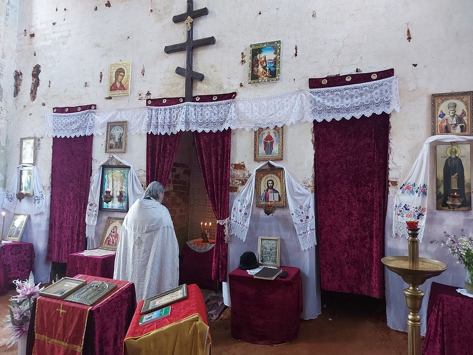 Праздник Казанской иконы Богородицы – последний день нашего пребывания в глубинке. Накануне в Казанской часовне деревни Иваньково совершили вечерню. В начале службы было всего две женщины. Ближе к окончанию в часовню ввалились три местных жительницы с красными мясистыми лицами. Громкие эмоции – «Ну, здравствуйте!», перебранка между собой с выкриками «задолбала!», «отстань!». Часовня враз наполнилась густым перегаром. Я подумал: «Похоже, что они уже начали отмечать предпразднество престольного праздника». В самый день праздника служба совершалась с 9 до 12 часов (часы, обедница, молебен с каноном, водосвятие и Крестный ход по деревне). Обратил внимание, что всего 5-6 домов в деревне жилые, и примерно столько же заброшенных. Во время Крестного хода одна из его участниц отлучилась в свой дом, в часовню она пришла с пакетом, в котором была банка молока и десяток яиц. Похоже, что в это же время она еще хлебанула – хряпнула водки. Возмущенно кричала, когда помощник фотографировал меня, осенявшего народ крестом во время пения многолетия, а ей казалось, что фотографируют ее. К сожалению, обычная беседа по окончании службы получилась непродолжительной по времени, так как эта женщина постоянно перебивала, не дожидаясь окончания беседы задавала вопросы, постоянно повторялась. Потом вообще стала кричать: «Смотрите не в книгу, а на меня, и отвечайте на мои вопросы». Несколько раз, уставившись на водосвятную чашу, громко требовала объяснить, что это такое – и все это происходит во время службы. Я был вынужден прервать беседу и вышел из часовни. Потом мне рассказывали, что она искренне удивлялась тому, что я прервал беседу, не ответив на ее вопросы. Когда мы уезжали, она активно махала нам рукой.