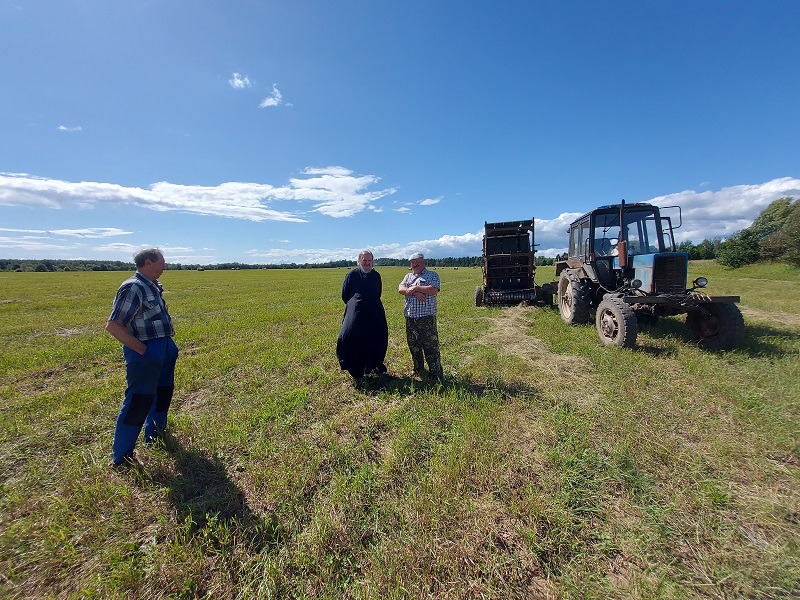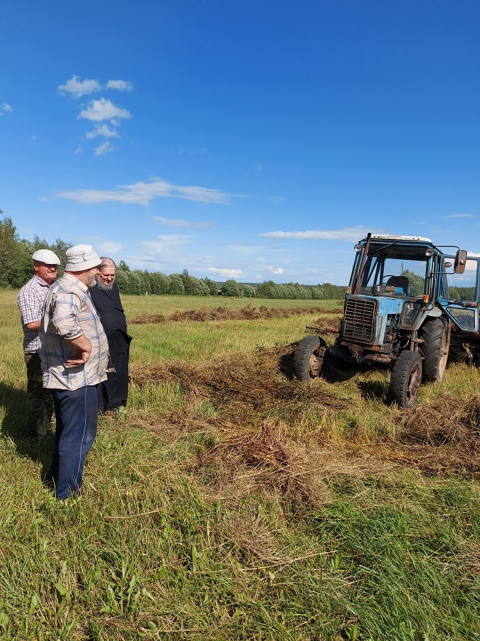 Перекусив на опушке леса, мы встретились с нашим давним знакомым, сельхозпредпринимателем Игорем Михайловичем. Он нам поведал, что в последнее время количество гектаров полей, которые он обрабатывает, уменьшилось в два с лишним раза, техника морально и физически устарела. Главная проблема – нехватка рабочих рук. В этой связи, по его мнению, неплохо было бы реанимировать закон о тунеядстве. Немногочисленным работникам в его хозяйстве, в основном, за 60. Игорь Михайлович сетовал, что электричество, обустроенное за счет колхозов, сейчас в руках тех, кому оно досталось даром, и которые не обеспечивают должной эксплуатации, а только гребут налоги. Горючее, которое стоило 2 копейки за литр (электричество – 4 копейки) стало очень дорогим, что ставит под удар рентабельность производства. Мы побывали на двух полях – на одном специальным агрегатом (прессом, который тянет трактор) собирают сено в валики, другим агрегатом (большими круглыми «граблями», прицепленными по бокам трактора) распушивали скошенный козлятник, чтобы он лучше просушивался. Игорь Михайлович показал яблоневый сад, который перед войной посадил председатель колхоза – его отец. После развала колхоза сад был передан сельской школе, а после ее закрытия оказался заброшенным. По словам нашего собеседника, расцвет деревни пришелся на 70-е годы, а в последующие десятилетия она только деградировала. Парадоксально, что та продукция, которую он выращивает и производит без всяких искусственных добавок - не востребована, так как не может конкурировать с продукцией, напичканной пестицидами, но ярко рекламируемой. Смены для себя наш добрый труженик не предвидит. Горько нам было слышать эти слова. Прощаясь с нами, Игорь Михайлович передал нам трехлитровую банку молока и большой пакет зелени.