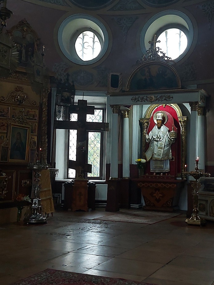 Подъезжая к поселку Теряево, слева видишь потрясающую панораму Иосифо-Волоцкого монастыря со множеством золотых куполов, а слева голубые купола Покровской церкви в с. Покровское. Построена церковь в 1792 году на средства прихожан. В начале нулевых годов по просьбе владыки Питирима в течение нескольких лет я опекал этот храм. Он был закрыт в хрущёвское время, в 1965 году, после чего в нем устроили склад ядохимикатов. Говорили, что последний священник церкви – о. Федор – собирал подписи с населения якобы для ремонта храма, а на самом деле, чтобы его закрыть (потом он повесился). За несколько десятилетий стены храма деформировались, сильно пострадала роспись. Мы заранее договорились с настоятелем, что приедем. Здесь тоже в дверях торчал ключ, и никого из людей не было (уже выйдя из храма, мы заметили видеокамеры). Вспоминали свои приезды сюда, радовались, увидя те предметы церковной утвари, которые сюда привозили, в частности, завесу с пришитыми на ней крестом с копием и лжицей, и со всеми буквицами, причём, не изнутри алтаря, а лицом к молящимся, как это было принято в древнерусской традиции. Жаль почти погибшей росписи (храм расписывал местный житель – художник), но, честно говоря, она была совершенно далека от канонических норм. Когда в алтаре я рассматривал «Моление о Чаше», вспомнил увиденные в Почаевской Лавре в подземном храме прп. Антония и Феодосия большие в рост изображения святых, оставшиеся от униатского периода (1720-1833). Эти изображения были мясистыми, непропорциональными с одутловатыми лицами – производили отталкивающее впечатление. Да, уровень иконописи очень четко характеризует духовный уровень эпохи, в этом смысле он является своеобразным барометром. За алтарем появился ряд захоронений насельников обители, в том числе, сравнительно молодого иеродиакона.