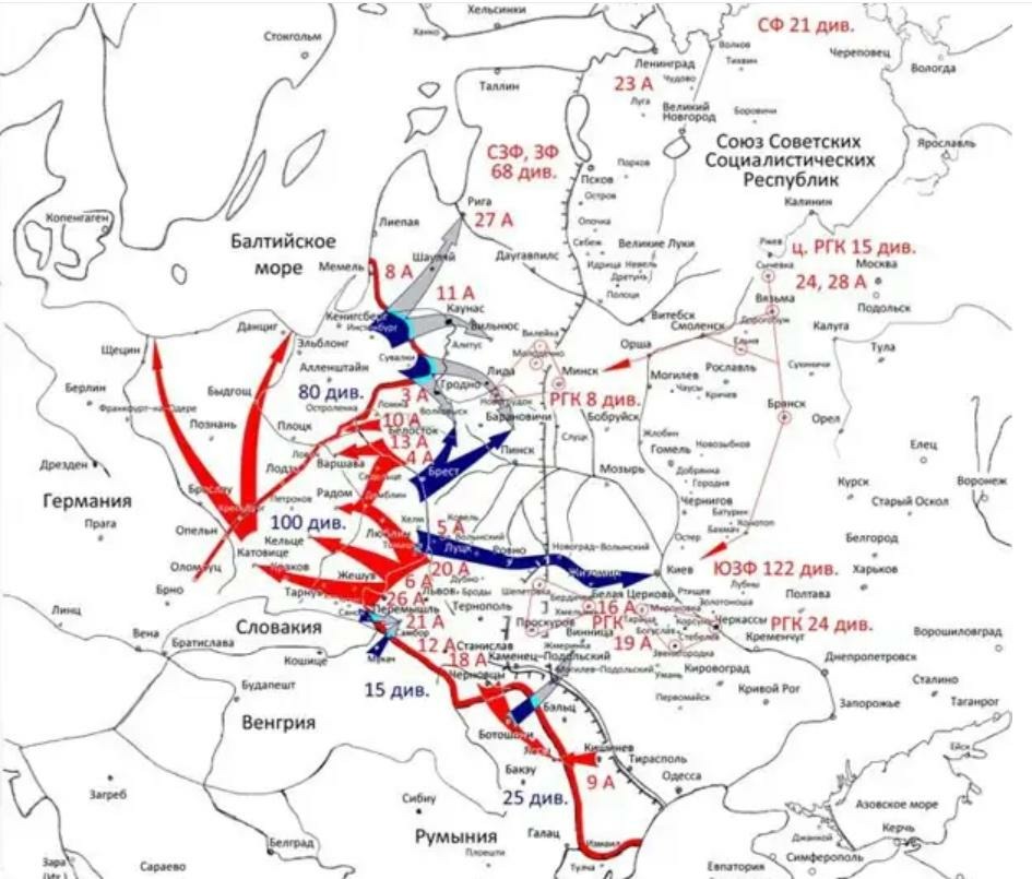 Схема 1. Действия Вооруженных Сил РККА на Европейском ТВД согласно плану развертывания от 15 мая 1941 года