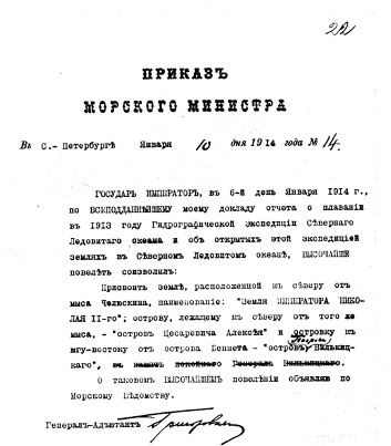 Присвоить землѣ, расположенной къ сѣверу отъ мыса Челюскина, наименованiе: «Земля ИМПЕРАТОРА НИКОЛАЯ II-го» ; острову, лежащему къ сѣверу отъ того же мыса, – «островъ Цесаревича Алексѣя» и островку к югу-востоку отъ острова Беннета – «остров Генерала Вилькицкаго»…».[36]