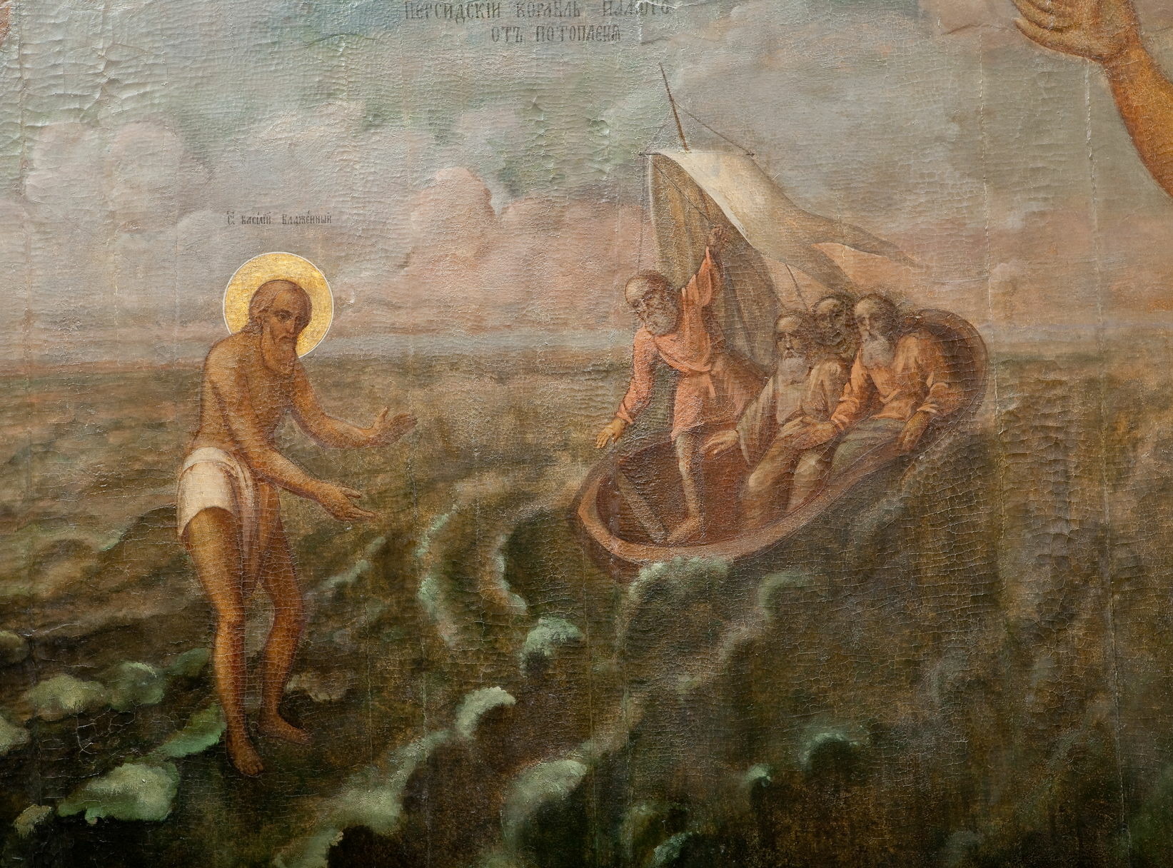 Вдруг рядом с судном показался рослый человек, он шел по морю так, как будто никакой бури не было; на его лице не было заметно и тени какой-либо тревоги; он ступил на палубу, и в ту же секунду волнение на море прекратилось, а ветер стих. Это был Василий, московский Блаженный.