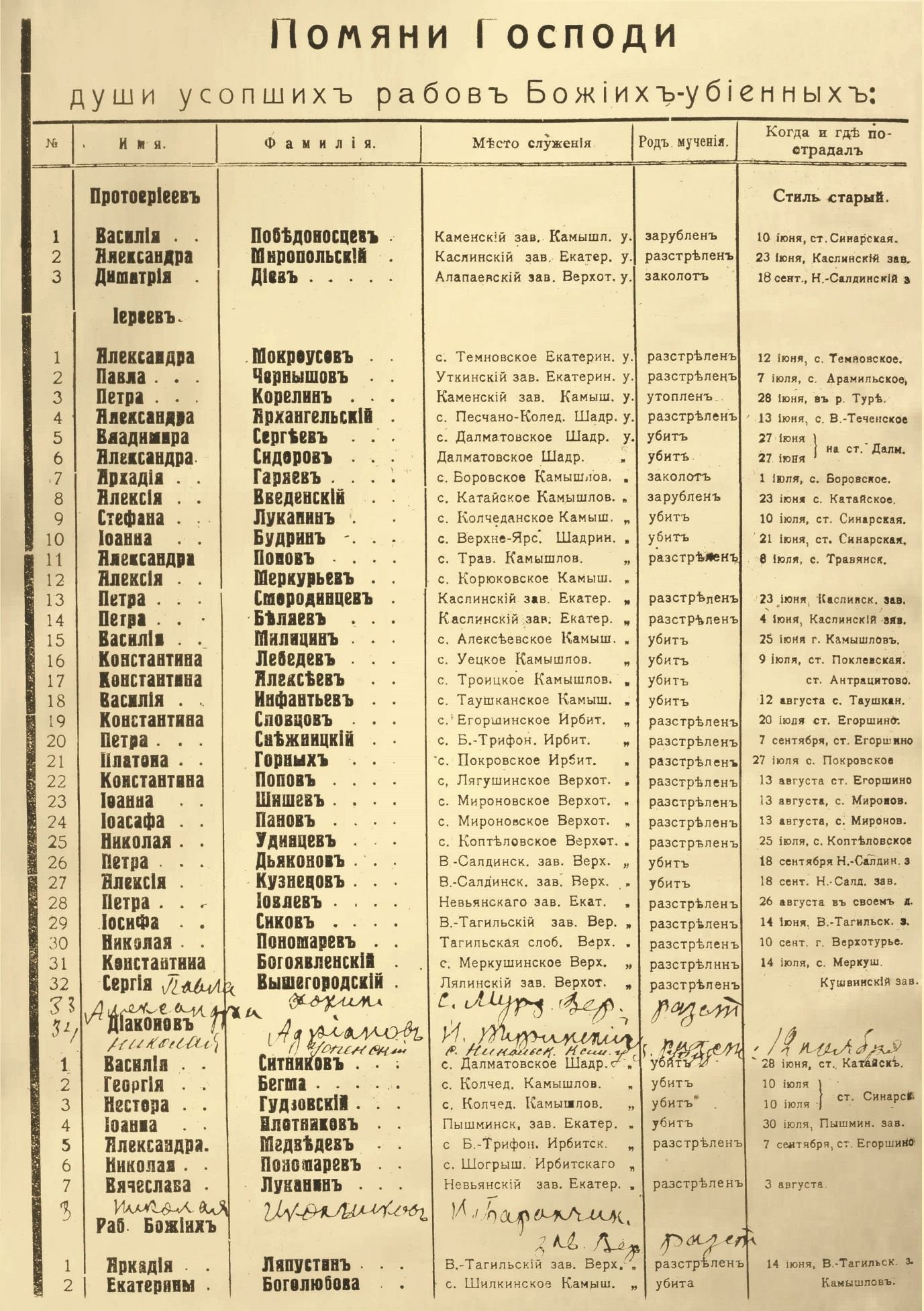 История 37 камышловских мучеников за веру до боли похожа на истории тысяч новомучеников репрессированных в годы безбожия и гонений на Церковь во многих городах и весях России. Их в одночасье объявили врагами, а потом убили. Убивали страшно, изощренно, с какой-то особой сатанинской жестокостью. Чаще убивали не мифические китайцы или мадьяры, горевшие ненавистью ко всему русскому, а свои, те, с кем будущие жертвы выросли, с кем играли в лапту и казаков-разбойников, ходили в один храм, в одну школу. Убили, а потом вымарали из истории и предали забвению, скрыли в архивах под грифом «секретно».
