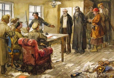 На анонсе: «Помещик и поп приговариваются к расстрелу революционным трибуналом. Валдай. 1919 г.»