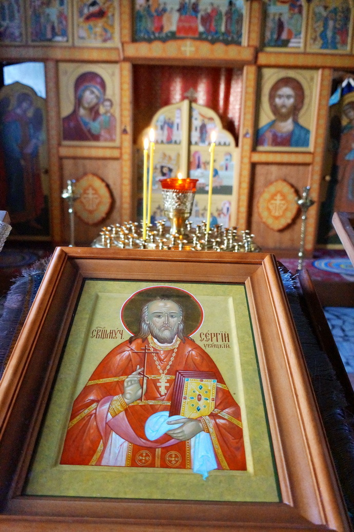 Священномученика Сергия Увицкого прославили на архиерейском Соборе 2006-го года, а его икона появилась в нашем храме спустя десять лет. Помню, стою, смотрю на икону и думаю, какое это чудо – прикоснуться к жизни святого, который жил не когда-то в древние времена, о которых мы понятия не имеем, а совсем недавно. У них было радио, у нас интернет, они устраивали музыкальные вечера, у нас – клубы, они гуляли по вечерам по знаменитой Торговой улице, где фланировали богатые камышловские купцы, и мы гуляем мимо тех же самых домов сохранившегося купеческого квартала. И Покровский собор сохранился почти без изменений. Отец Сергий служил в алтаре, где мы сейчас служим, с этого амвона говорил народу проповеди, вот там, в углу на скамеечке, с какой-нибудь бабушкой сердобольной после службы разговаривал. У нас до сих пор в храме сохранились иконы, возле которых он молился, фрески на которые он смотрел.