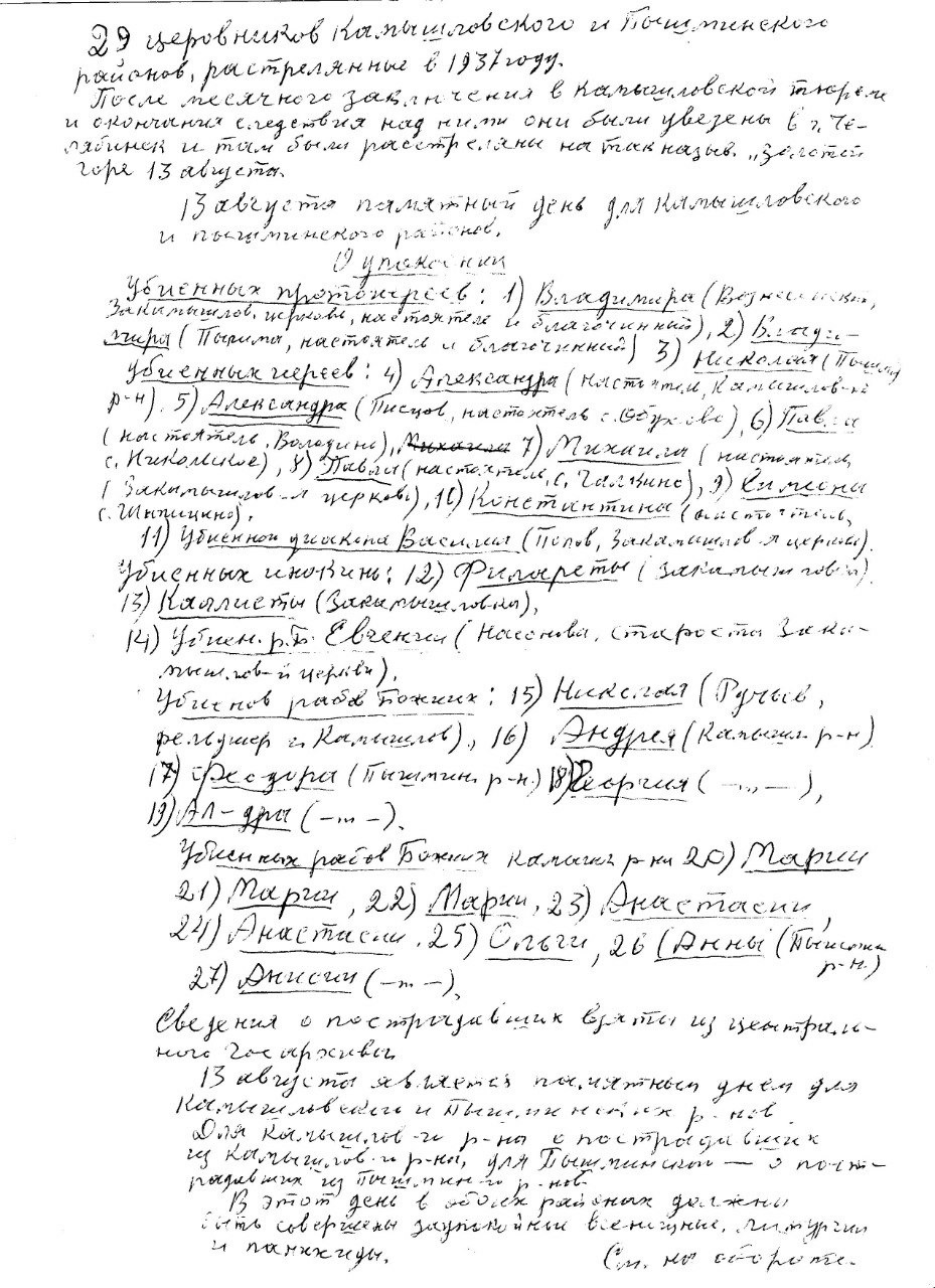 Рукописный список священномучеников Камышлова прот. Василия Семенова. Из личного архива бывшего настоятеля храма Симеона Верхотурского в Обухово, клирика Покровского собора иерея Игоря Холманских