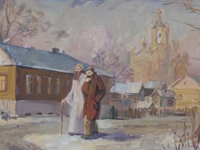 Разговор о Боге. Павел Бажов и настоятель Покровского собора Сергей Увицкий. Акварель Екатерины Куликовой, ДШИ №5 Екатеринбурга, преподаватель Е.В. Барышева, прихожанка Покровского собора