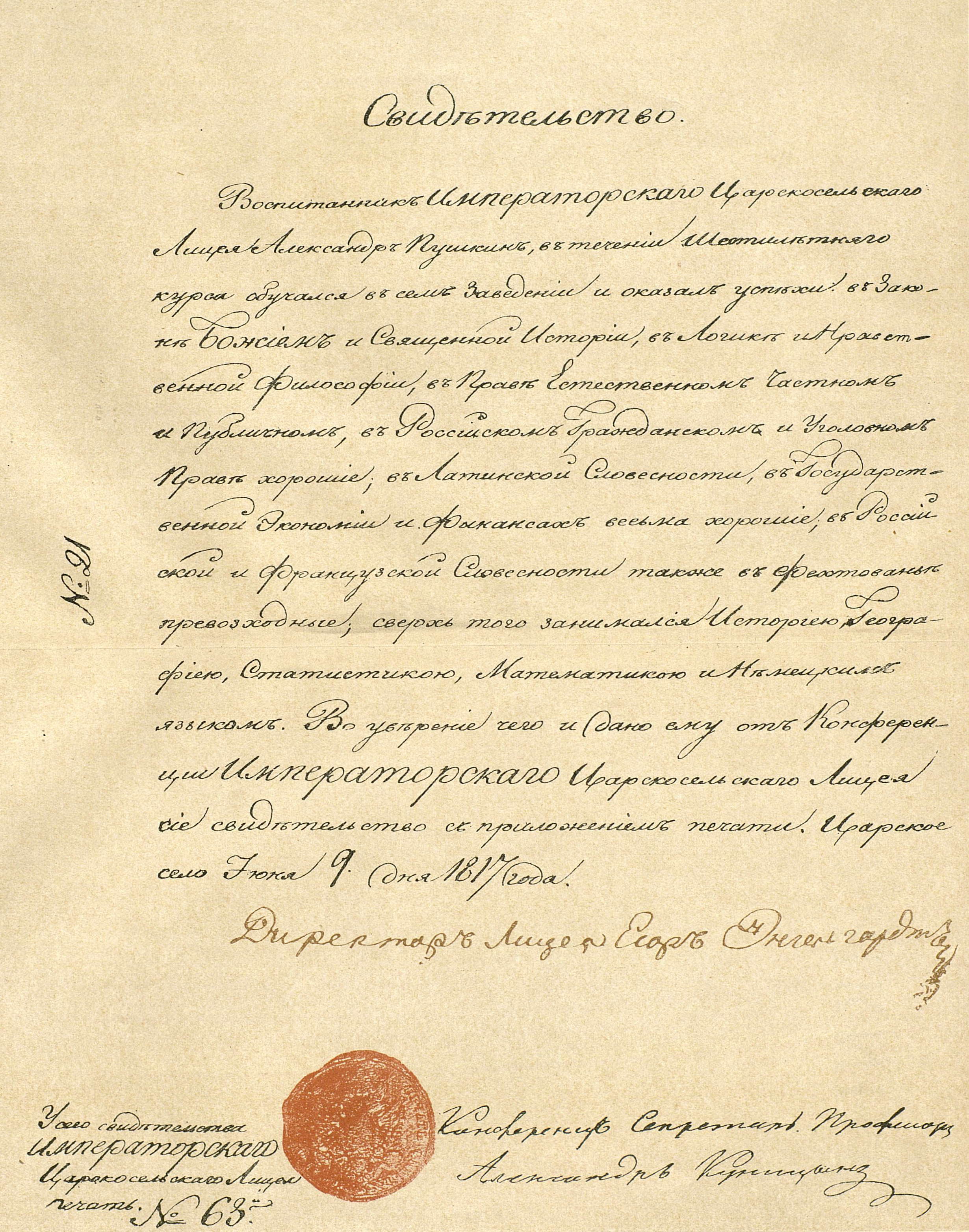 Пушкин получал гуманитарное образование, и упрекать его в слабой математической подготовке, если бы и была таковой, не солидно. В свидетельстве по окончании лицея перечислены дисциплины, которые он изучал, и успехи по ним: в законе Божьем и священной истории, в логике и нравственной философии, в праве естественном, частном и публичном, в российском гражданском и уголовном праве хорошие; в латинской словесности, в государственной экономии и финансах весьма хорошие, в российской и французской словесности, также в фехтовании превосходные; сверх того занимался историей, географией, статистикой, математикой и немецким языком. (Приложение № 1)