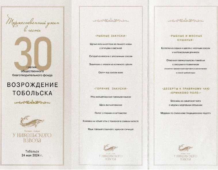 На память каждый получил красивый буклет – меню торжественного ужина в честь 30-летия общественного благотворительного фонда «Возрождение Тобольска». Не могу не привести его полностью:
