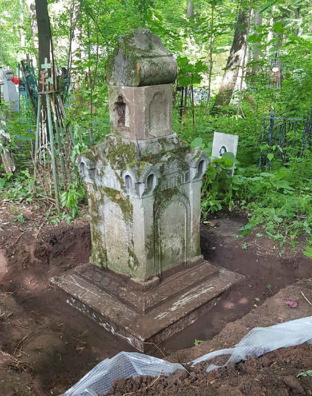 На исторической фотографии был запечатлен каменный монументальный памятник купцу Кузнецову. Памятник был обнаружен нами в грунте, восстановлен и вновь поставлен на исторический фундамент. При совмещении фрагментов памятника шов между ними даже не заметен.