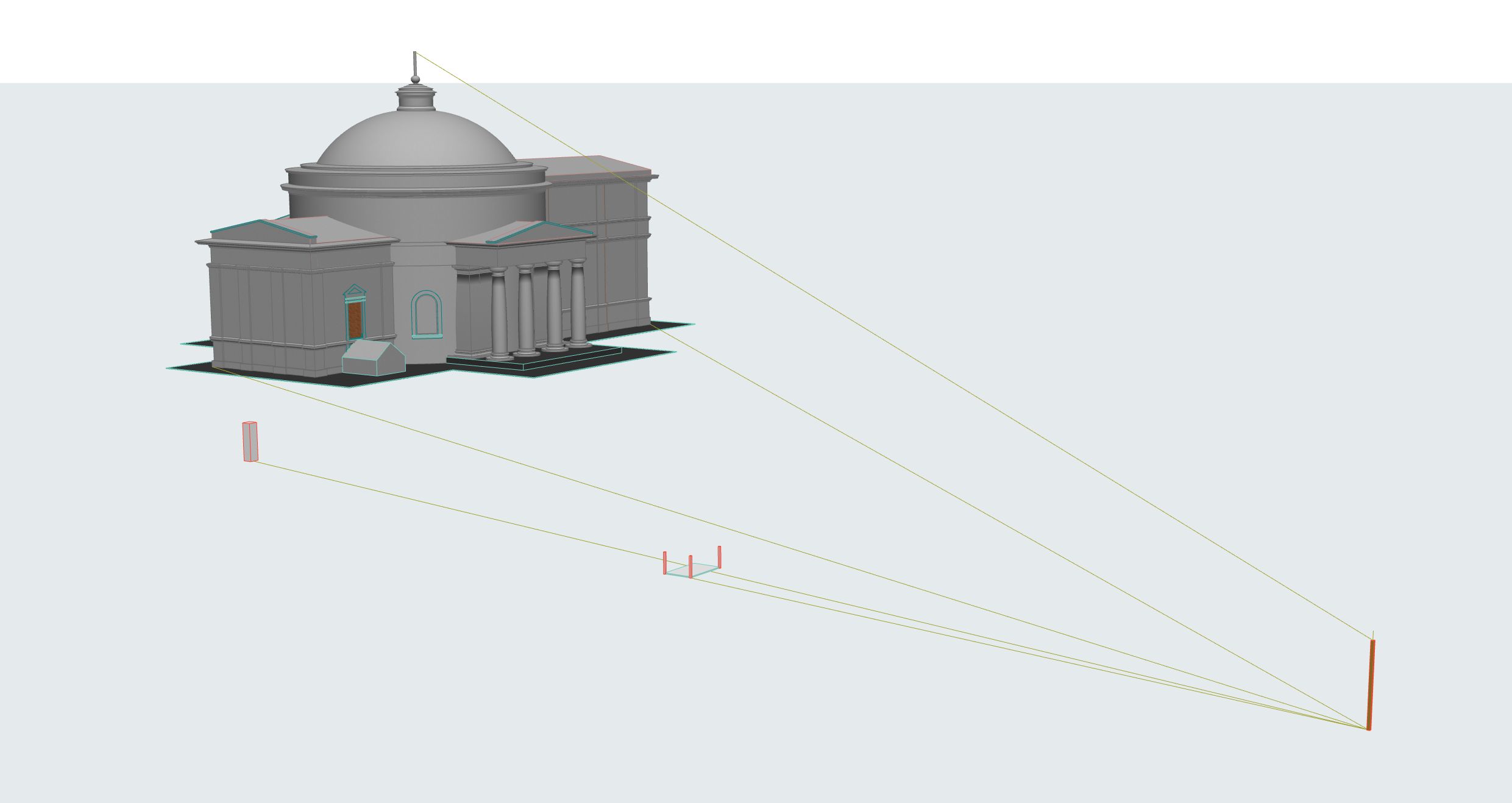 Далее, для полноценной привязки трехмерной модели была произведена санитарная расчистка больных деревьев, закрывавших для обзора часть храма. Тогда полностью открылся Всехсвятский храм, и тем самым третья точка для триангуляции начала работать зрительно. Таким образом, сузилась площадь изысканий – до внутренней площади треугольника.