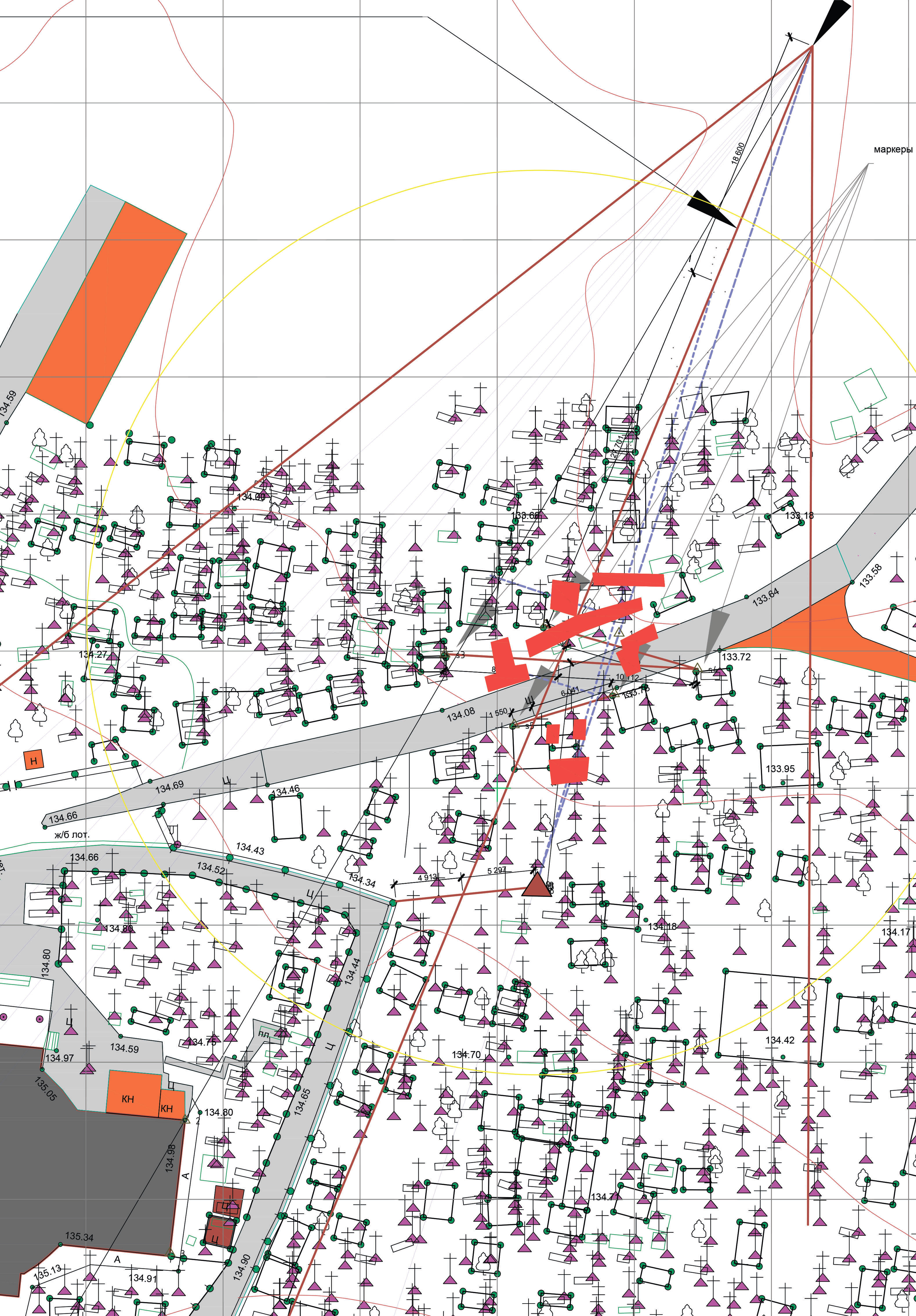 При появлении новых точек привязки (памятника купцу Кузнецову и точки фотографа) геодезист выстроил линию поиска – съемки – была натянута веревка между точкой фотографа, крестами, стоявшими на захоронении фрейлин и памятником.