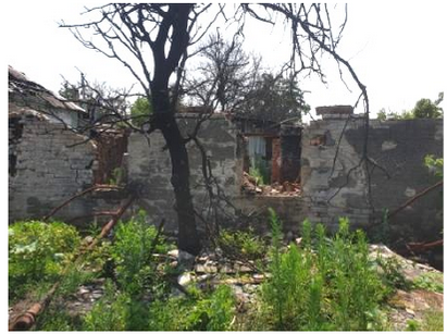 На въезде в село нас встречал раскуроченный прямым попаданием из танка украинский БМП. Башня взрывной волной отброшена метров на пятьдесят в сторону и едва видна из высокой травы. Село опустело, дома через один разбиты, но жители постепенно начинают возвращаться на родные пепелища.