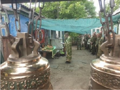 Надо сказать, что ребята в штабе артдивизиона пытались шифроваться по условиям военного времени и не выдавать своего месторасположения посреди Лисичанска. Часовой стоял за забором, военнослужащие выходили на улицу словно мирные обыватели в шортах и шлепанцах, но когда по завершению литургии звонарь Вадим ударил во все колокола и через мощные колонки зазвучал гимн России в исполнении Газманова, думаю, с маскировкой было покончено уже навсегда. Колокольный звон разносился по всему городу и это было торжеством Православия на освобожденной от нацистов Украинской земле.