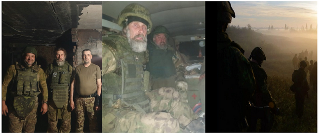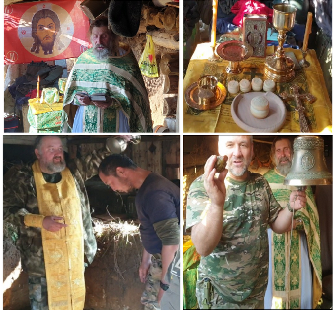 Чтобы ехать дальше, нам нужно было дождаться темноты. Начиненные взрывчаткой FPV-дроны не «видят» в темноте, в дневное же время, мы – легкая мишень для противника. Мы расположились до вечера в «отжатом у немцев» опорнике. Он представлял из себя обычный окоп с оборудованными огневыми позициями и щель для укрытия от артиллерийского огня в виде зарытого в землю весьма добротно сработанного сруба с двойным или тройным накатом. В щели были оборудованы спальные места без печи и обогрева, конечно. Огонь здесь разводить нельзя ни в каком виде. Здесь же, в окопе на опорнике, мы служили литургию и крестили бойцов. Вадим умудрился притащить сюда даже средний колокол и изображал московский праздничный трезвон с помощью языка и неактивной гранаты. Все удивлялись – как же ловко у него это получается, талант!