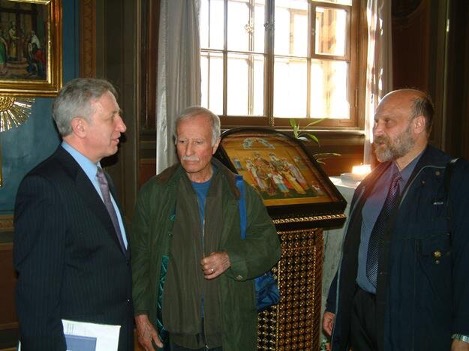 Киносценарист Г.Т. Рябов и В.Н. Соловьев во время передачи иконы Святых Царственных Страстотерпцев в Екатерининский придел Петропавловского собора. На снимке слева директор Государственного музея истории Санкт-Петербурга Б.С. Аракчеев. Икона написана и передана в дар монахинями Александро-Невского Ново-Тихвинского монастыря — женского православного монастыря в Екатеринбурге. Фото С.А. Никитина