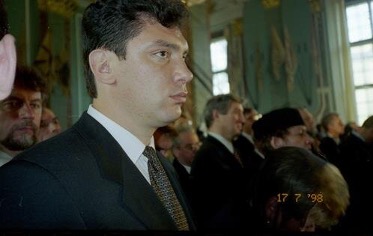 Траурная церемония в Петропавловском соборе Санкт-Петербурга 17 июля 1998 года. Первый вице-премьер Б.Е. Немцов. За ним слева В.В. Аксючиц. Фото В. Соловьева