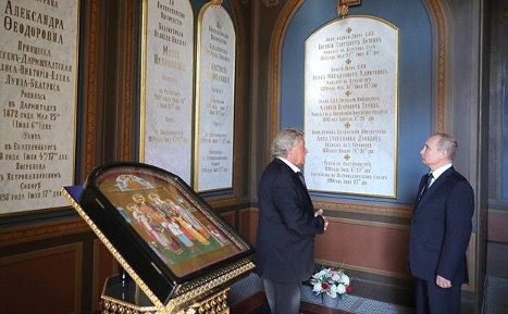 Президент Российской Федерации В.В. Путин возлагает цветы у захоронения Семьи Императора Николая II и его верных слуг в Екатерининском приделе Петропавловского собора. Слева директор музея-заповедника А.Н. Колякин.