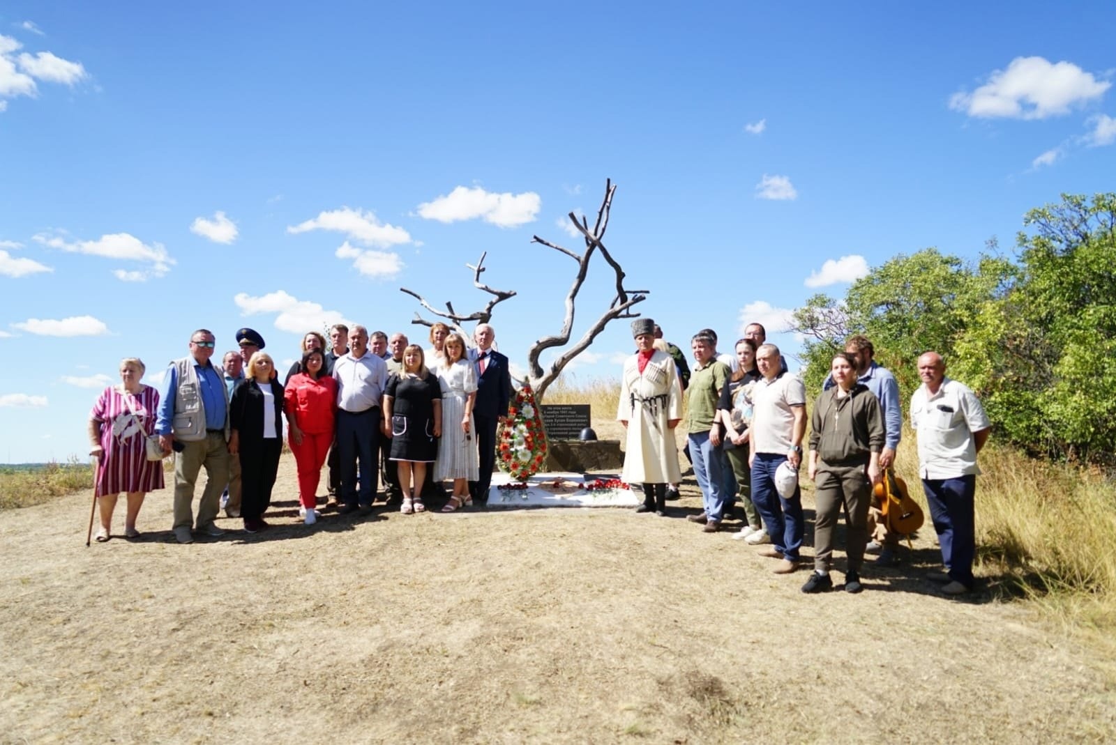 Поклониться священному месту гибели героя приехали из Адыгеи его родственники и земляки, пришли местные жители, среди которых мать ополченца, погибшего на 2014 году. Добрые слова сказал гостям глава поселковой администрации Александр Бондаренко. В завершение небольшого митинга, над степью прозвучала песня «На безымянной высоте»...