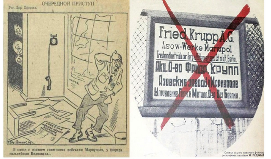 Плакаты времен Великой Отечественной. «Очередной приступ: В связи с взятием советскими войсками Мариуполя, у фюрера сильнейшая Волноваха …» и Азовсталь в Мариуполе – завод акционерного общества Круппа