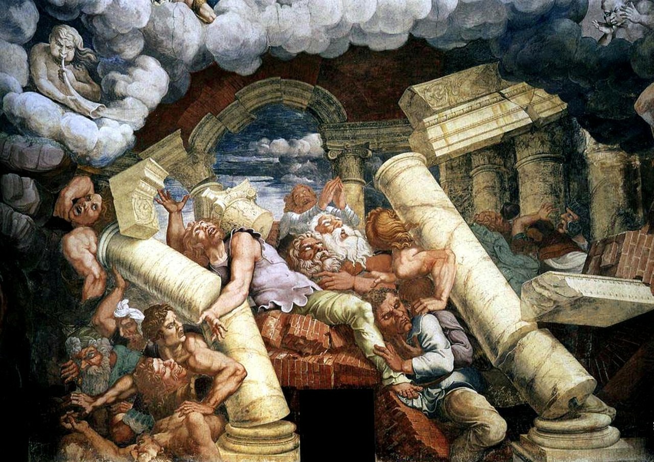 Война гигантов. Роспись «Зала гигантов» во дворце Палаццо дель Те, г. Мантуя. Худ. Джулио Романо, 1532 г. Именно здесь в г. Мантуя, как указывал Нанни из Витербо, были обнаружены многие из опубликованных им древних рукописей.