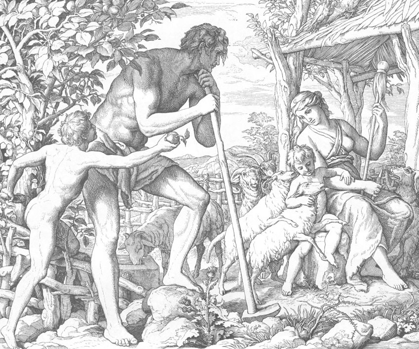 Семейство Адама и Евы. «Адам познал Еву, жену свою; и она зачала, и родила Каина. И еще родила брата его, Авеля» (Быт. 4:1). Гравюра Ю. Карольсфельда, 1857 г.