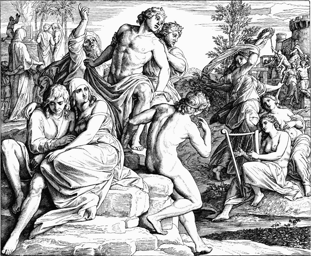 «Сыны Божии увидели дочерей человеческих, что они красивы, и брали [их] себе в жены, какую кто избрал» (Быт. 6:2). Художник отобразил версию толкования понятия «Сыны Божии», как «благочестивых» потомков Сифа, а не как падших ангелов-стражей. Иллюстрация к Библии Ю.Ш. фон Карольсфельда, XIX век.